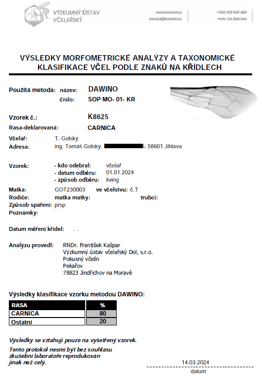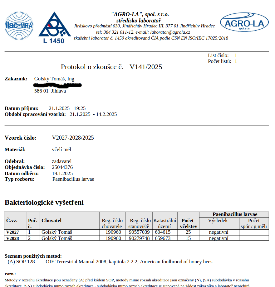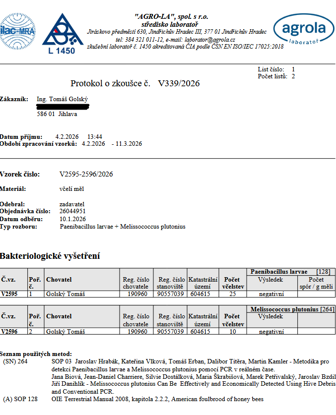 Negativní vyšetření na mor a hnilobu včelího plodu